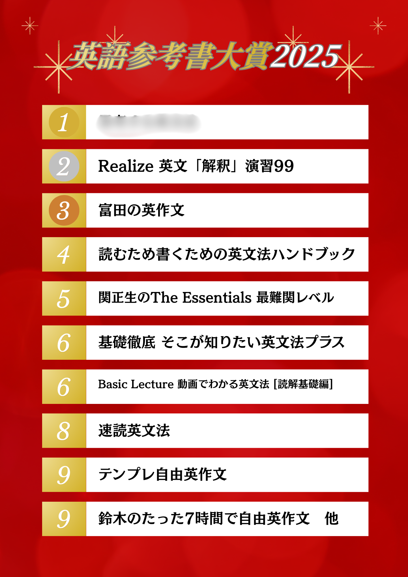※9位は宮下卓也『テンプレ自由英作文』、鈴木健士『大学受験ムビスタ 鈴木のたった7時間で自由英作文』、中邑光男、柏野健次、山岡憲史 編集主幹『ジーニアス 総合英語 第3版』が同率。
